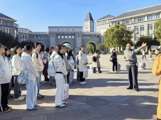 活动伊始,商学院邓文娟老师带领同学们参观一师校园,结合校园景观,讲述我校发展中的红色故事,引导学生感受我校深厚的文化底蕴与红色基因。