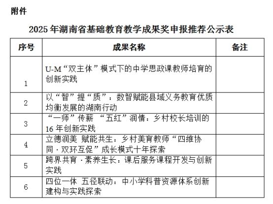 根据湖南省教育厅《关于开展2025年湖南省教学成果奖评审工作的通知》(湘教通〔2025〕143号),学校按照要求积极组织了申报工作。经教师申报,学院推荐,拟确定推荐“U-M“双主体”模式下的中学思政课教师培育的创新实践”等六个项目申报省级基础教育教学成果奖。现将推荐结果予以公示如下: